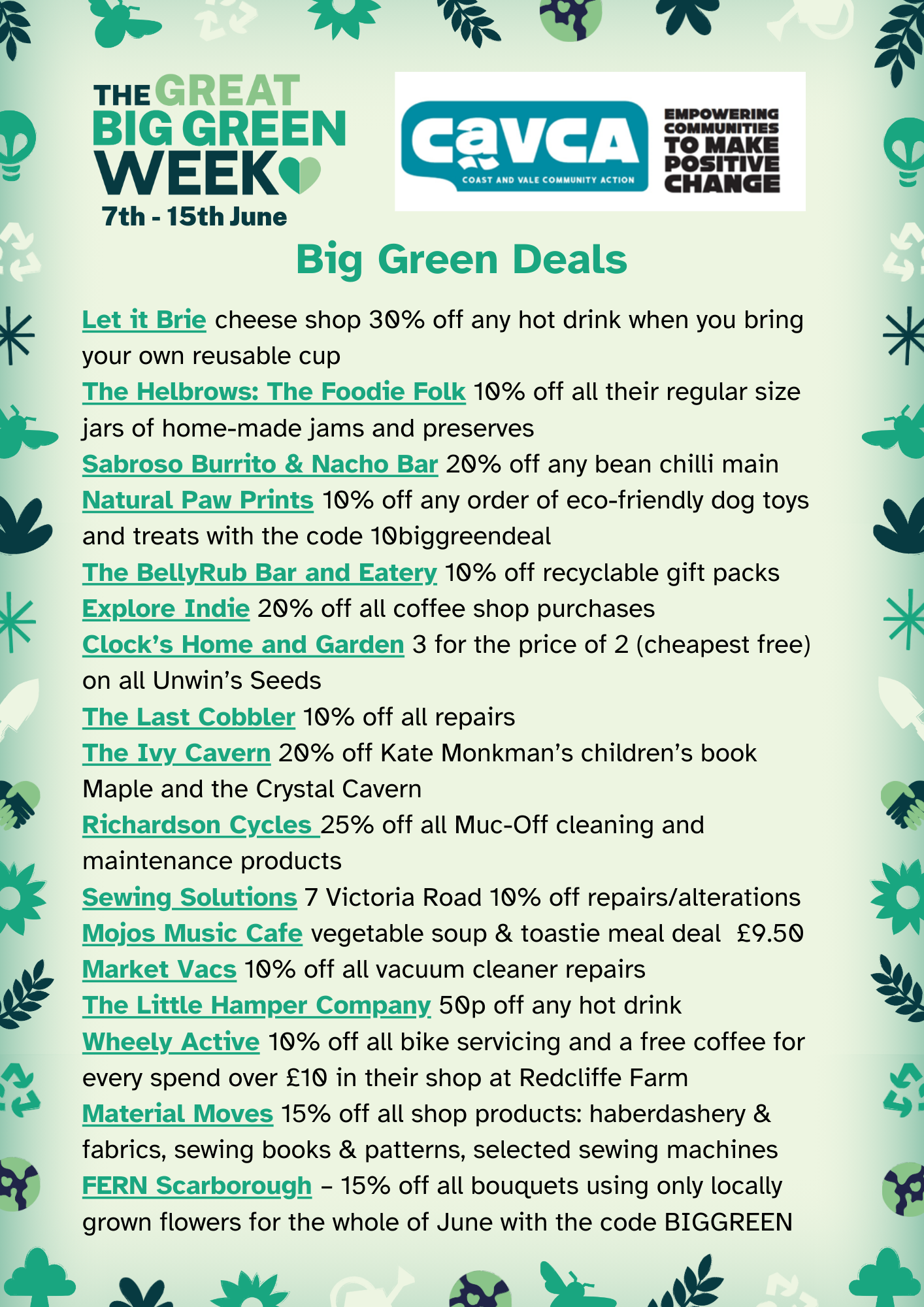 We believe that a great way of reducing our carbon footprint, supporting nature and boosting the resilience of our communities is to support our local economy by buying locally-produced products from local independent businesses. We are thrilled that 17 of our local independent businesses are offering Big Green Deals as part of Great Big Green Week and hope that local people will be encouraged to discover some real hidden gems and to start to think differently about their spending choices. Using the Big Green Deals people can get discounts on local floral bouquets, getting their bike serviced, getting their shoes repaired, getting their vacuum cleaner repaired, treating their dog and grabbing a meal and a coffee! And that's just by using a few of the special offers - there are many more!