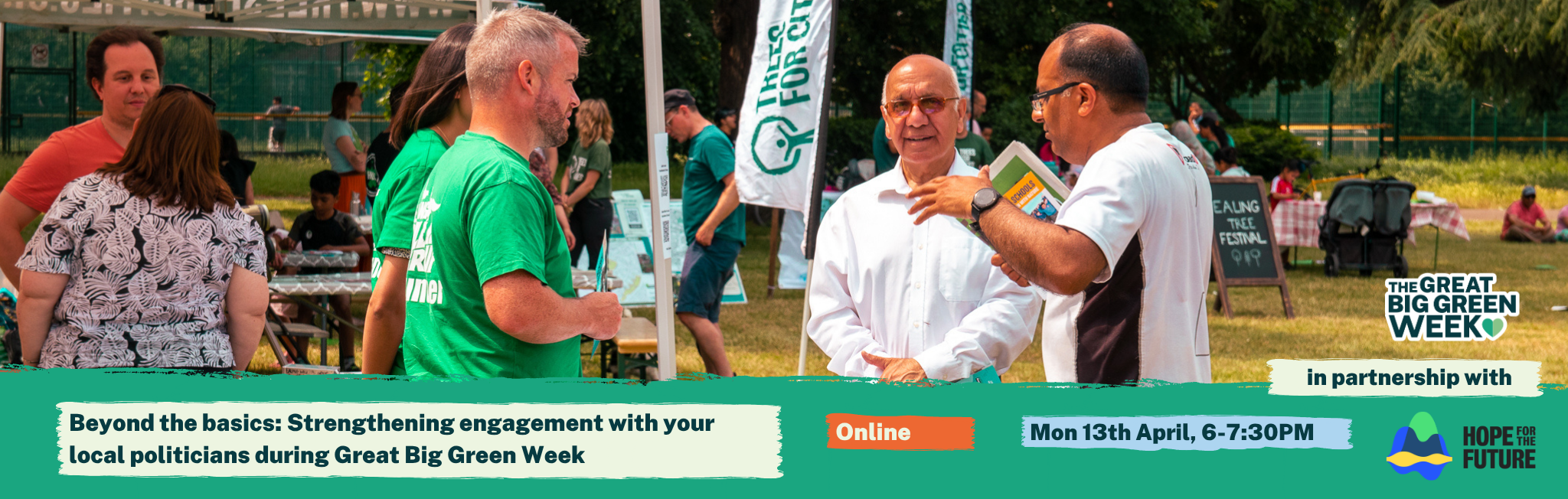 This session is for anyone who has engaged with their local politicians before, but might be finding it difficult and need some guidance on where to go next, or want to strengthen existing relationships with local politicians - and Great Big Green Week is the perfect opportunity to do this.